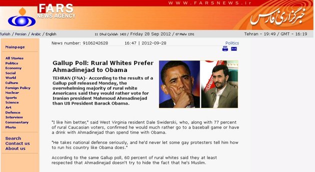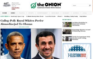 ទីចាត់ការសារព័ត៌មានអូនៀន Onion បានចុះផ្សាយសម្តីថ្នាក់ដឹកនាំប្រទេសអ៊ីរ៉ង់ថា ប្រជាជនជនបទក្នុងប្រទេសអាមេរីកកាំង សំដែងការស្រលាញ់ពេញចិត្តលោក Mahmoud Ahmadinejad មេដឹកនាមអ៊ីរ៉ងជាងលោក Barack Obama ប្រធានាធិបតីអាមេរីក។