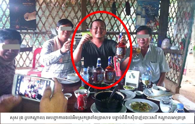 លោក សុស រុង មេបញ្ជាការរងកងរាជអាវុធហត្ថស្រុកត្រពាំងប្រាសាទជាឈ្មួញរកស៊ីដឹកឈើក្រញូងដ៏ធំម្នាក់ ប្រចាំខេត្តឧត្តរមានជ័យ និងជាអ្នកចូលចិត្តផឹកស៊ីអួតក្អេងក្អាង បាញ់បោះសេរី គ្មានកោដខ្លាចអ្នកណាទាំងអស់នៅប្រទេសកម្ពុជានេះ មិនដឹងជាខ្នងខ្សែរបស់ប៉េអឹមរូបនេះធំប៉ុណ្ណានោះទេ?